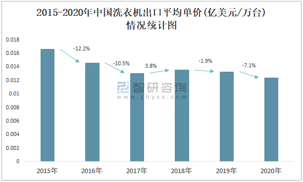 2015-2020年中國洗衣機(jī)出口平均單價(jià)(億美元/萬臺)情況統(tǒng)計(jì)圖