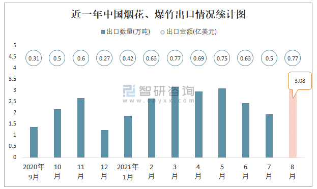 根據中國海關數據顯示:2021年8月中國煙花、爆竹出口數量為3.08萬噸,同比下降16.1%,出口金額為0.77億美元,同比下降9.4%;2021年1-8月中國煙花、爆竹出口數量為21.15萬噸,出口金額為5.17億美元。