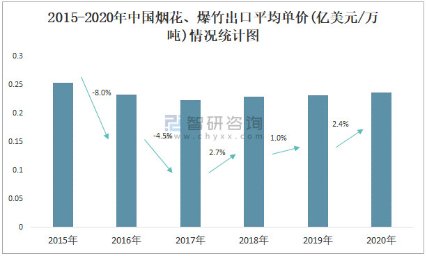 2015-2020年中國煙花、爆竹出口平均單價(億美元/萬噸)情況統計圖