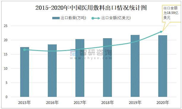 2015-2020年中國(guó)醫(yī)用敷料出口情況統(tǒng)計(jì)圖