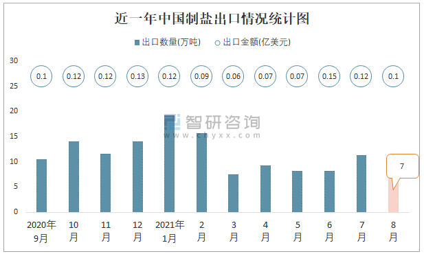 近一年中國制鹽出口情況統計圖