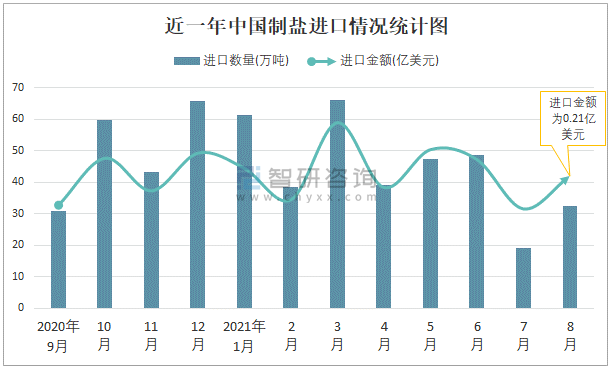 根據中國海關數據顯示:2021年8月中國制鹽進口數量為32.59萬噸,同比下降2.5%,進口金額為0.21億美元,同比增長32.3%,2021年8月中國制鹽出口數量為7萬噸,同比下降16.9%,出口金額為0.1億美元,同比增長33.1%;2021年1-8月中國制鹽進口數量為353.47萬噸,進口金額為1.74億美元,出口數量為86.15萬噸,出口金額為0.77億美元。