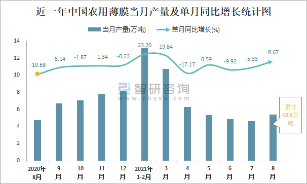 近一年中國(guó)農(nóng)用薄膜當(dāng)月產(chǎn)量及單月同比增長(zhǎng)統(tǒng)計(jì)圖