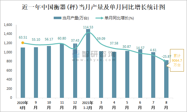根據(jù)國家統(tǒng)計局?jǐn)?shù)據(jù)顯示:2021年8月中國衡器(秤)產(chǎn)量為830萬臺,同比下降25.87%;2021年1-8月中國衡器(秤)累計產(chǎn)量為9064.7萬臺,同比增長54.02%;2015-2020年中國衡器(秤)產(chǎn)量總體呈現(xiàn)上升趨勢,2020年達(dá)到最高。