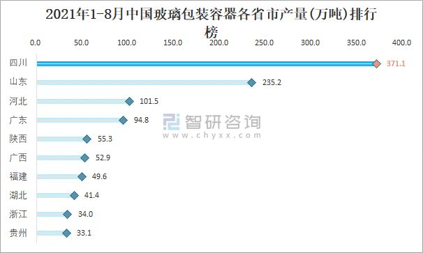 2021年1-8月中國玻璃包裝容器各省市產量排行榜