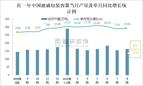 根據國家統計局數據顯示:2021年8月中國玻璃包裝容器產量為163萬噸,同比增長10.82%;2021年1-8月中國玻璃包裝容器累計產量為1257.7萬噸,同比增長14.2%;2015-2020年中國玻璃包裝容器產量2018年跌至最低,次年有所回升。