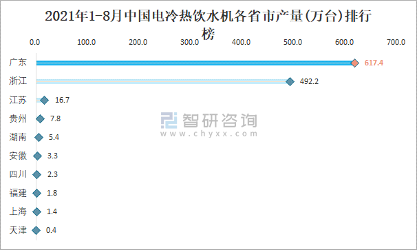 2021年1-8月中國電冷熱飲水機各省市產量排行榜