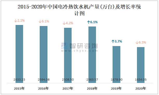 2015-2020年中國電冷熱飲水機產量及增長率統計圖