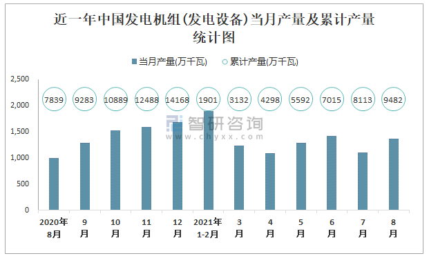 近一年中國發(fā)電機組(發(fā)電設(shè)備)當月產(chǎn)量及累計產(chǎn)量統(tǒng)計圖