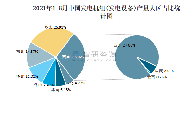 2021年1-8月中國發(fā)電機組(發(fā)電設(shè)備)產(chǎn)量大區(qū)占比統(tǒng)計圖