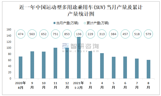 根據國家統計局數據顯示:2021年8月中國運動型多用途乘用車(SUV)產量為61.1萬輛,同比下降20.2%;2021年1-8月中國運動型多用途乘用車(SUV)累計產量為578.6萬輛,累計增長15.4%;2015-2020年中國運動型多用途乘用車(SUV)產量2017年達到最高,此后逐年遞減。
