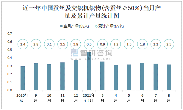 根據(jù)國(guó)家統(tǒng)計(jì)局?jǐn)?shù)據(jù)顯示:2021年8月中國(guó)蠶絲及交織機(jī)織物(含蠶絲≥50%)產(chǎn)量為0.3億米,同比下降1.1%;2021年1-8月中國(guó)蠶絲及交織機(jī)織物(含蠶絲≥50%)累計(jì)產(chǎn)量為2.5億米,累計(jì)下降0.7%;2015-2020年中國(guó)蠶絲及交織機(jī)織物(含蠶絲≥50%)產(chǎn)量2016年達(dá)到最高,此后逐年遞減。