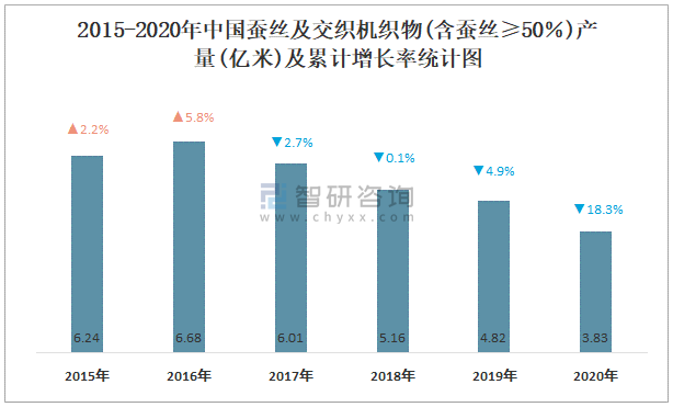 2015-2020年中國(guó)蠶絲及交織機(jī)織物(含蠶絲≥50%)產(chǎn)量及累計(jì)增長(zhǎng)率統(tǒng)計(jì)圖