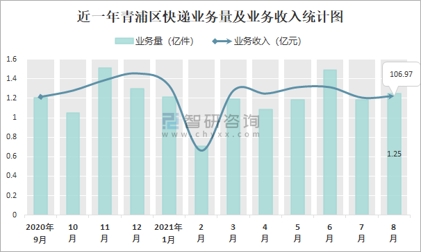 2021年8月青浦區快遞業務量與業務收入分別為12547.1萬件和1069740萬元