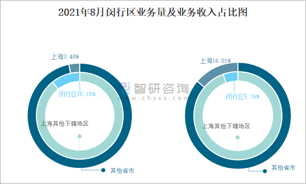 根據各省市郵政局數據可知:2021年8月閔行區快遞業務量占上海快遞業務量的12.15%,上海快遞業務量占全國快遞業務量的3.48%;2021年8月閔行區快遞業務收入占上海快遞業務收入的5.76%,上海快遞業務收入占全國快遞業務收入的16.01%。