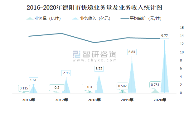 2016-2020年德陽市快遞業務量及業務收入統計圖