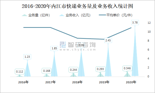 2016-2020年內江市快遞業務量及業務收入統計圖