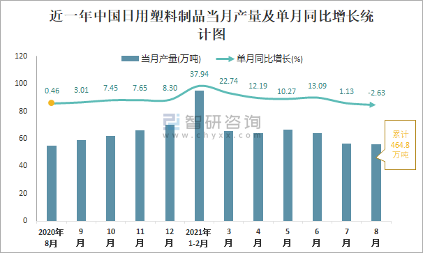 根據(jù)國家統(tǒng)計(jì)局?jǐn)?shù)據(jù)顯示:2021年8月中國日用塑料制品產(chǎn)量為56.1萬噸,同比下降2.63%;2021年1-8月中國日用塑料制品累計(jì)產(chǎn)量為464.8萬噸,同比增長18.57%;2015-2020年中國日用塑料制品產(chǎn)量2018年跌至最低,此后逐年遞增。