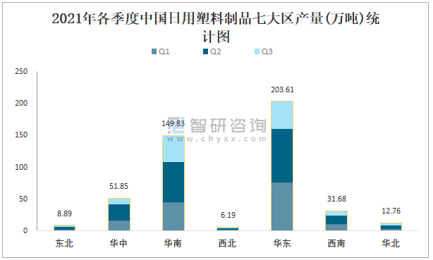 2021年各季度中國日用塑料制品七大區(qū)產(chǎn)量統(tǒng)計(jì)圖