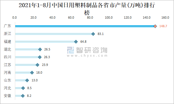 2021年1-8月中國日用塑料制品各省市產(chǎn)量排行榜