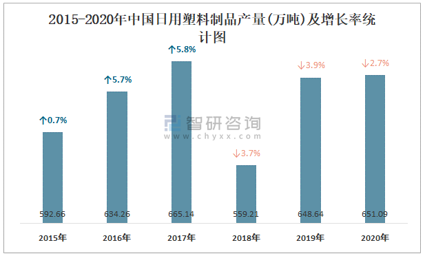 2015-2020年中國日用塑料制品產(chǎn)量及增長率統(tǒng)計(jì)圖