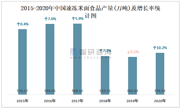 2015-2020年中國速凍米面食品產量及增長率統計圖