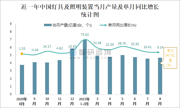 根據國家統計局數據顯示:2021年8月中國燈具及照明裝置產量為4.7億套(臺、個),同比增長9.14%;2021年1-8月中國燈具及照明裝置累計產量為34.7億套(臺、個),同比增長31.38%;2015-2020年中國燈具及照明裝置產量2019年達到最高,次年出現小幅度下滑。