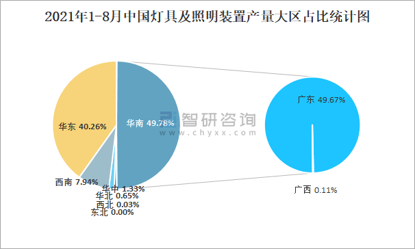 2021年1-8月中國燈具及照明設置產量大區占比統計圖