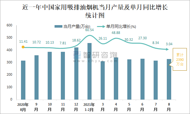 根據(jù)國家統(tǒng)計(jì)局?jǐn)?shù)據(jù)顯示:2021年8月中國家用吸排油煙機(jī)產(chǎn)量為328萬臺,同比增長3.04%;2021年1-8月中國家用吸排油煙機(jī)累計(jì)產(chǎn)量為2390萬臺,同比增長27.68%;2015-2020年中國家用吸排油煙機(jī)產(chǎn)量2019年達(dá)到最高,次年呈現(xiàn)小幅度下滑。