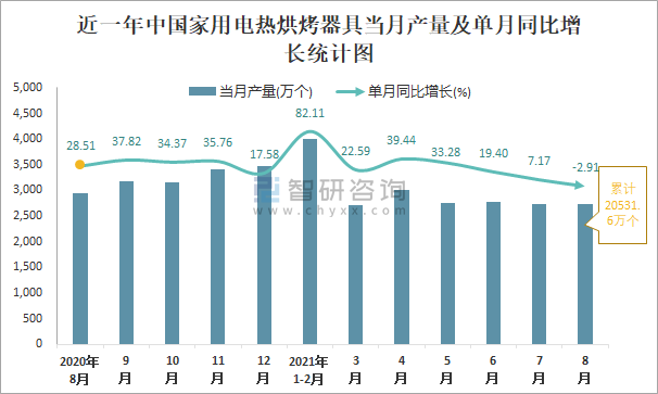 根據國家統計局數據顯示:2021年8月中國家用電熱烘烤器具產量為2738萬個,同比下降2.91%;2021年1-8月中國家用電熱烘烤器具累計產量為20531.6萬個,同比增長32.03%;2015-2020年中國家用電熱烘烤器具產量2016年跌至最低,此后逐年遞增。
