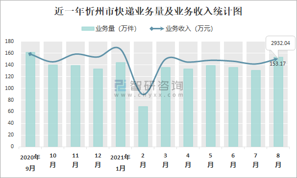 近一年忻州市快遞業務量及業務收入統計圖