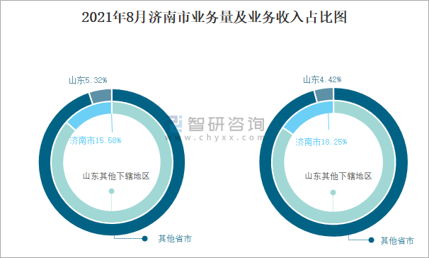 2021年8月濟(jì)南市業(yè)務(wù)量及業(yè)務(wù)收入占比圖