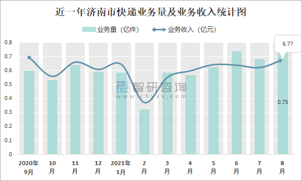 近一年濟(jì)南市快遞業(yè)務(wù)量及業(yè)務(wù)收入統(tǒng)計(jì)圖