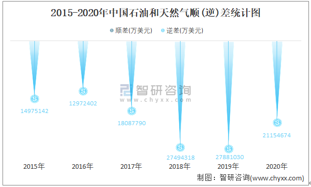 2015-2020年中國石油和天然氣順(逆)差統計圖
