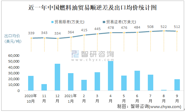 根據中國石油和化學工業聯合會數據顯示:2021年9月中國燃料油進口數量為116.7萬噸,出口數量為150.2萬噸;進口金額為57330萬美元,出口金額為76911萬美元;近一年中國燃料油出口總金額大于進口總金額,貿易順差為主,出口均價512美元/噸。
