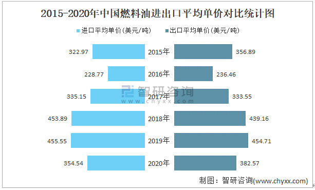 2015-2020年中國燃料油進出口平均單價對比統計圖