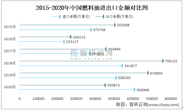 2015-2020年中國燃料油進出口金額對比統計圖