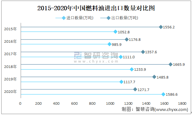 2015-2020年中國燃料油進出口數量對比統計圖