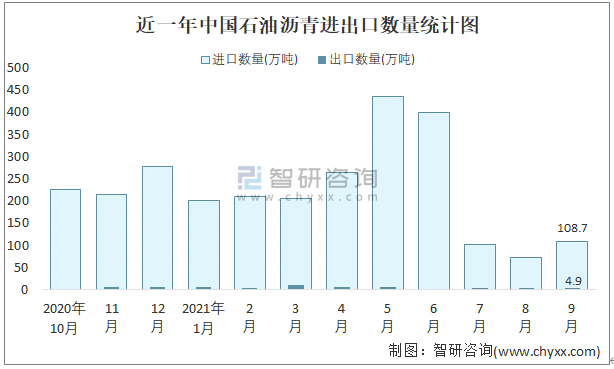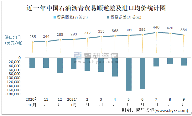 根據中國石油和化學工業聯合會數據顯示:2021年9月中國石油瀝青進口數量為108.7萬噸,出口數量為4.9萬噸;進口金額為41787萬美元,出口金額為2563萬美元;近一年中國石油瀝青出口總金額小于進口總金額,貿易逆差為主,進口均價384美元/噸。