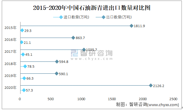 2015-2020年中國石油瀝青進出口數量對比統計圖