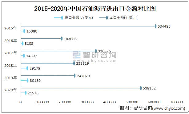 2015-2020年中國石油瀝青進出口金額對比統計圖