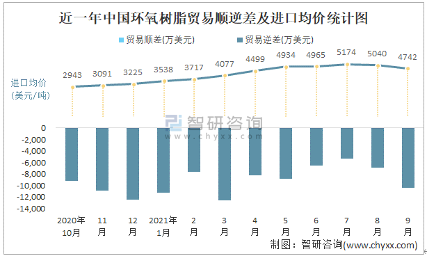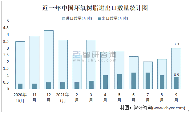 根據中國石油和化學工業聯合會數據顯示:2021年9月中國環氧樹脂進口數量為3萬噸,出口數量為0.9萬噸;進口金額為14227萬美元,出口金額為3797萬美元;近一年中國環氧樹脂出口總金額小于進口總金額,貿易逆差為主,進口均價4742美元/噸。