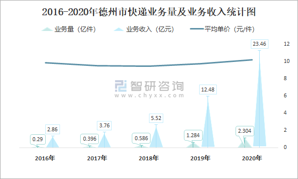 2016-2020年德州市快遞業務量及業務收入統計圖