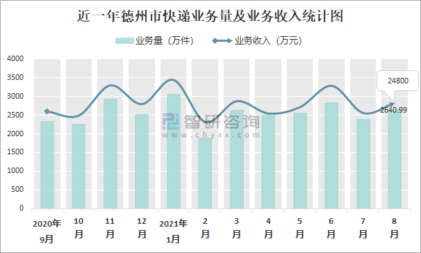 根據各省市郵政局數據可知:2021年8月德州市快遞業務量占山東快遞業務量的5.52%,山東快遞業務量占全國快遞業務量的5.32%;2021年8月德州市快遞業務收入占山東快遞業務收入的6.69%,山東快遞業務收入占全國快遞業務收入的4.42%。