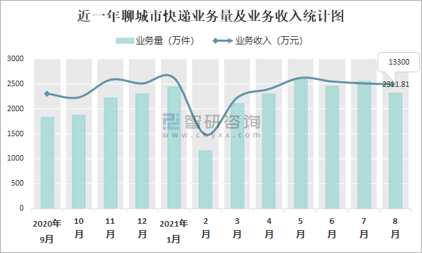 近一年聊城市快遞業務量及業務收入統計圖