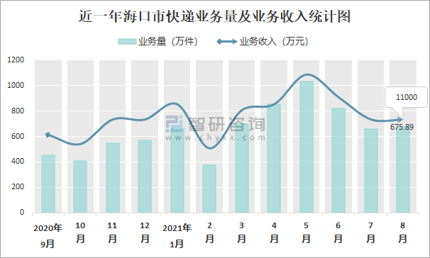 近一年海口市快遞業務量及業務收入統計圖