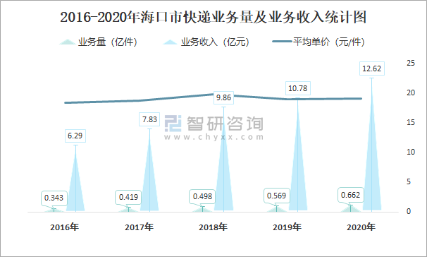 2016-2020年海口市快遞業務量及業務收入統計圖