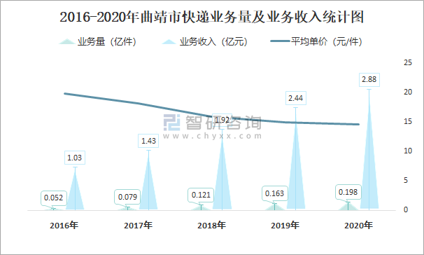 2016-2020年曲靖市快遞業(yè)務(wù)量及業(yè)務(wù)收入統(tǒng)計(jì)圖