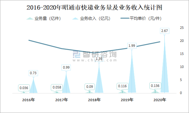 根據(jù)各省市郵政局?jǐn)?shù)據(jù)可知:2021年8月昭通市快遞業(yè)務(wù)量為158.79萬(wàn)件,業(yè)務(wù)收入為3197.03萬(wàn)元;2021年1-8月昭通市快遞累計(jì)業(yè)務(wù)量為1081.38萬(wàn)件,同比增長(zhǎng)73.47%,累計(jì)業(yè)務(wù)收入為22925.7萬(wàn)元,同比增長(zhǎng)66.36%;2016-2020年昭通市快遞業(yè)務(wù)量與業(yè)務(wù)收入均逐年遞增,平均單價(jià)2018年跌至最低,此后逐年遞增。