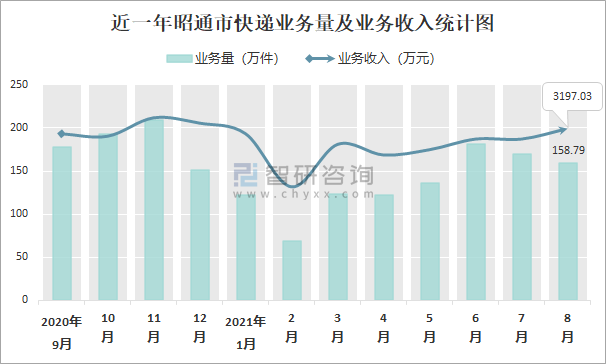 近一年昭通市快遞業(yè)務(wù)量及業(yè)務(wù)收入統(tǒng)計(jì)圖